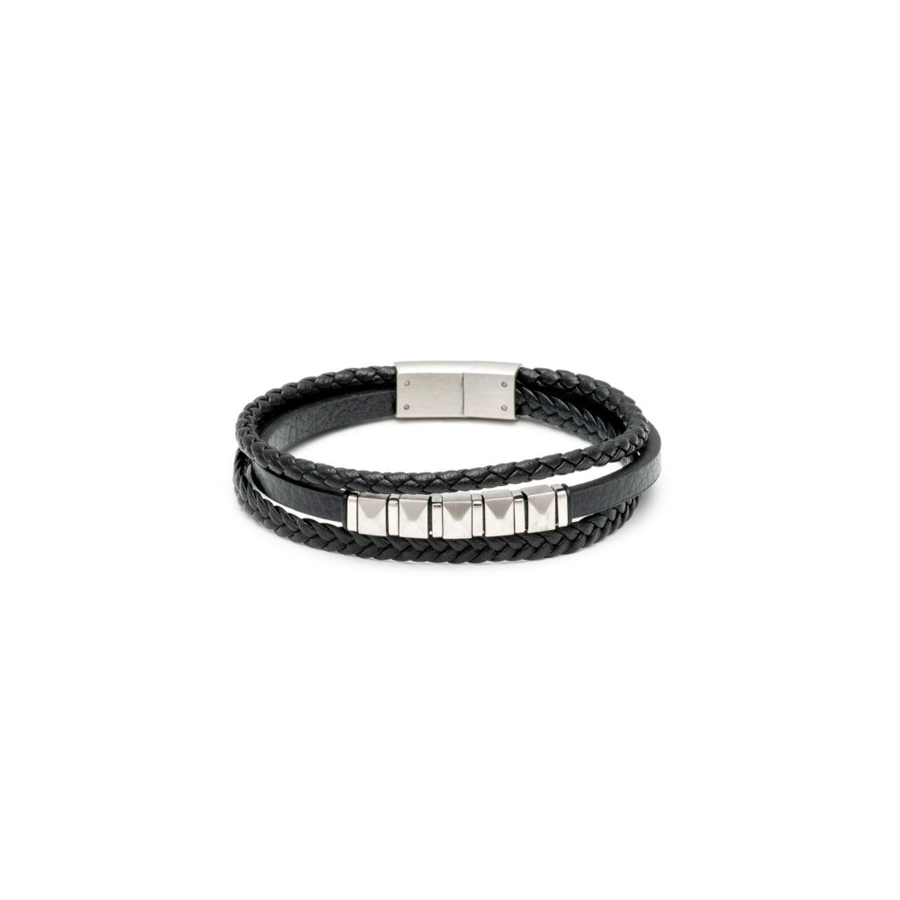 Βραχιόλι αντρικό από ανοξείδωτο ατσάλι και μαύρο δέρμα, Xρώμα μετάλλου : Ασημί