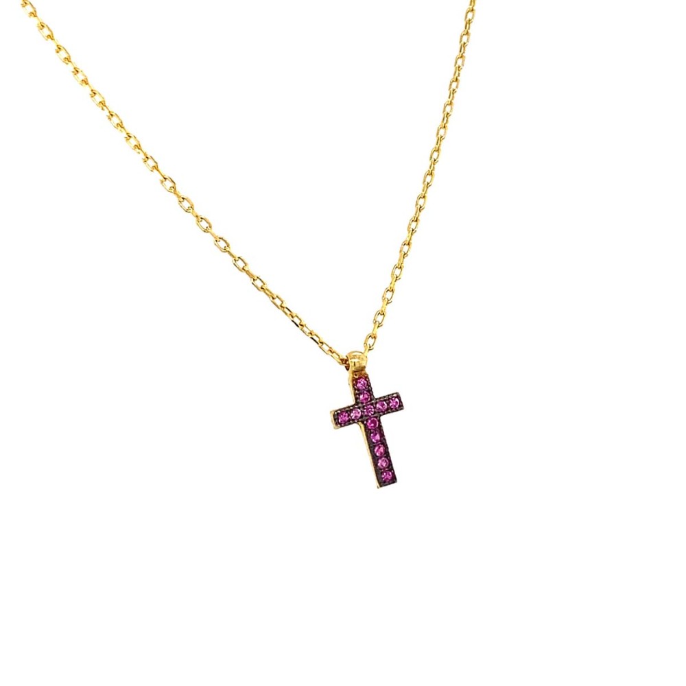 Μενταγιόν γυναικείο από επιχρυσωμένο ασήμι 925 με κρεμαστό στοιχείο σταυρουδάκι με ρόζ ζιργκόν.
