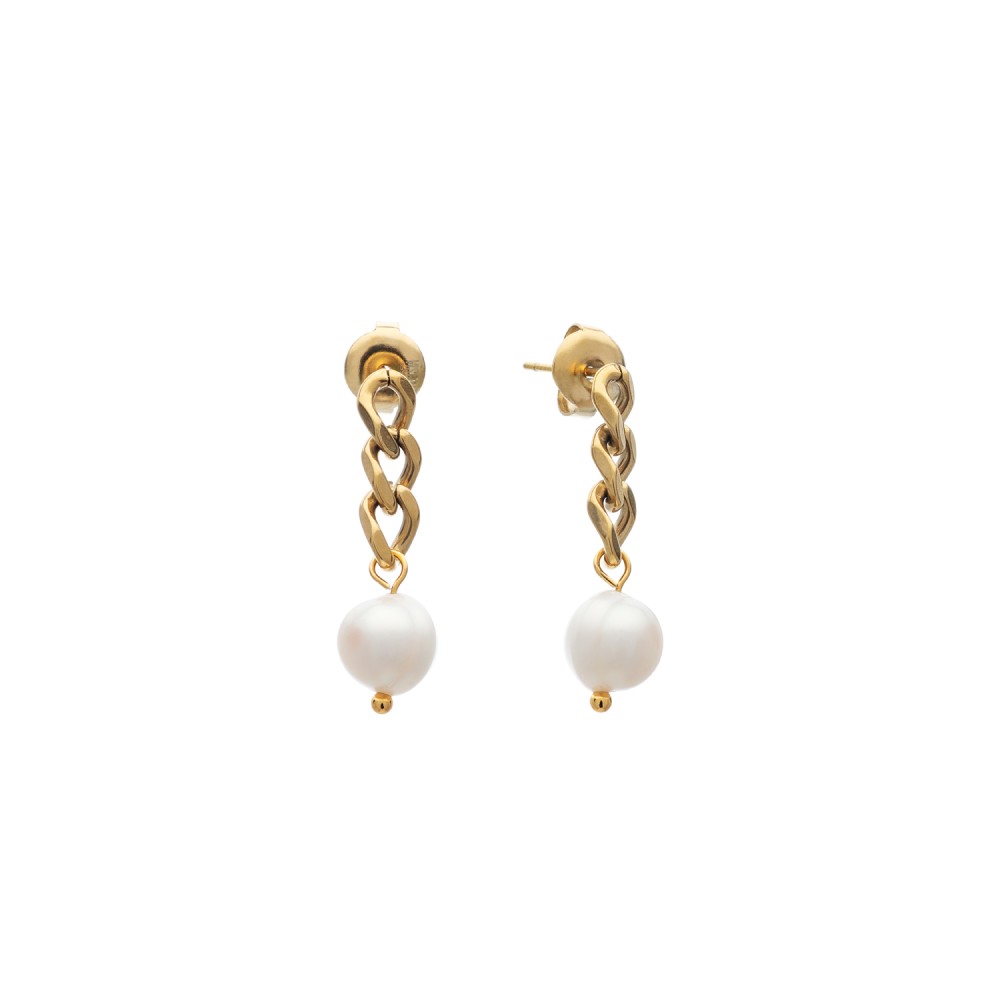 Σκουλαρίκι κρεμαστό από ανοξείδωτο ατσάλι, χρώματος χρυσό αλυσίδα με κρεμαστή πέρλα χρώματος λευκή.