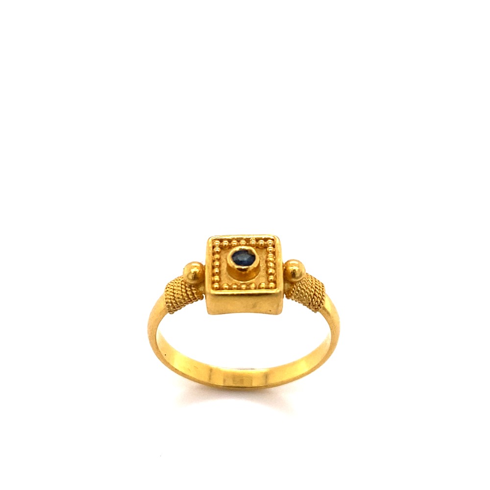 Χρυσό δαχτυλίδι 22 καρατίων, σχέδιο αρχαίου κοσμήματος με πέτρα ζαφείρι στο κέντρο.