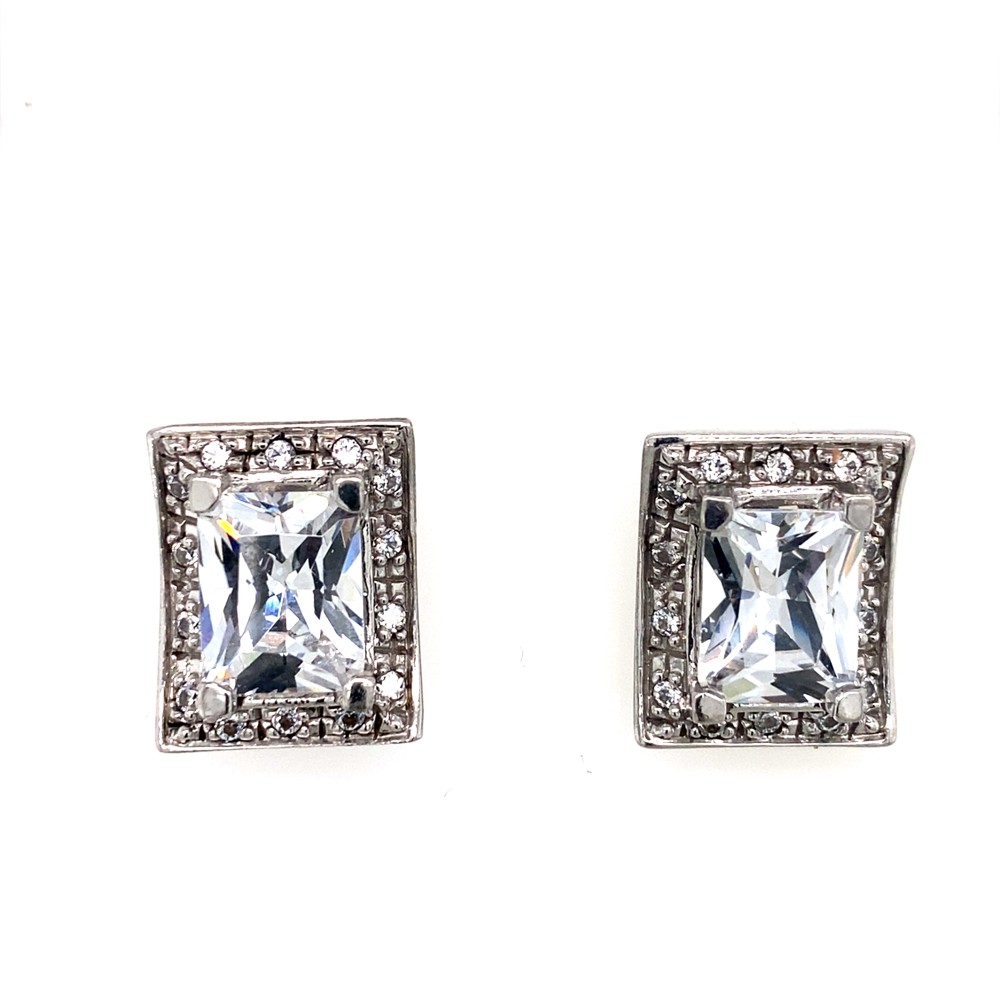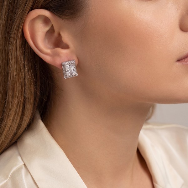 Ασημένιο σκουλαρίκι με μοντέρνο γεωμετρικό σχεδιασμό. Στο κέντρο είναι ένα εντυπωσιακό ζιργκόν σε ορθογώνια κοπή. Η minimal αλλά και η κλασική γραμμή του το καθιστά ιδανικό για καθημερινές εμφανίσεις όσο και για πιο ιδιαίτερες περιστάσεις.