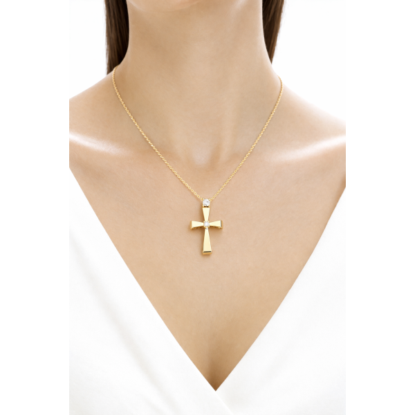 Χρυσός σταυρός 14Κ με λουστρέ επιφάνεια και πέτρα ζιργκόν στη μέση του σταυρού. Λεπτοκαμωμένο φινίρισμα. Τιμή με αλυσίδα.