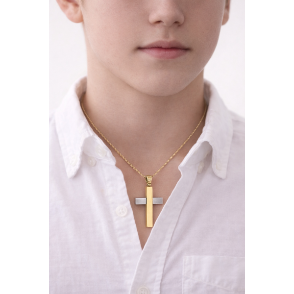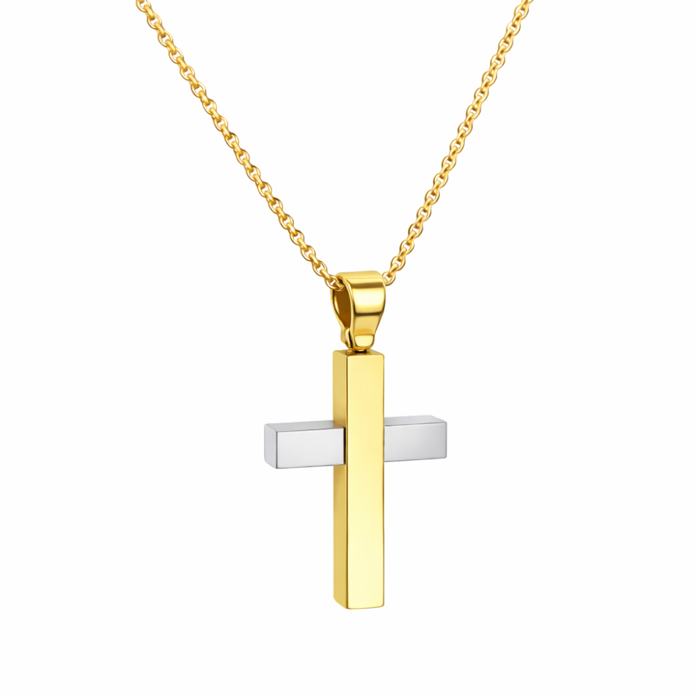 Χρυσός δίχρωμος σταυρός 14 καρατίων σε μοντέρνα minimal γραμμή, με γεωμετρικό σχεδιασμό που συνδυάζει κομψότητα και διαχρονικότητα.