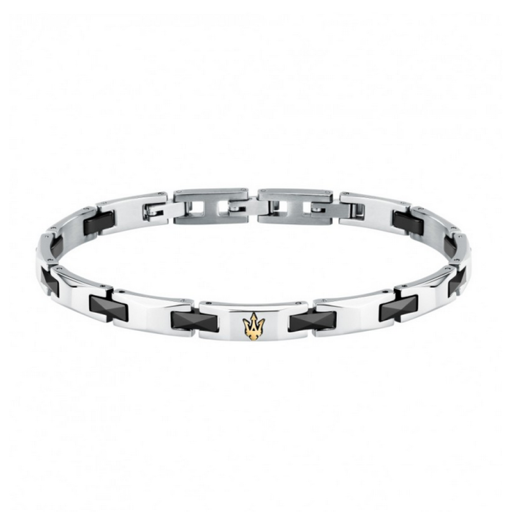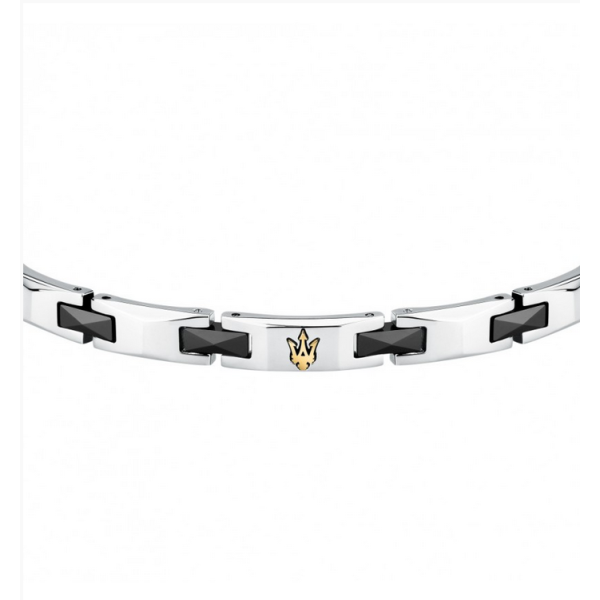Ανδρικό βραχιόλι του επώνυμου Ιταλικού οίκου Maserati όπου είναι κατασκευασμένο από ανοξείδωτο ατσάλι. Μοντέρνο κόσμημα της σειράς ''Ceramic'' που κοσμείται με υπέροχα κεραμικά στοιχεία σε μαύρο χρώμα και με το λογότυπο της εταιρείας σε χρυσό χρώμα.