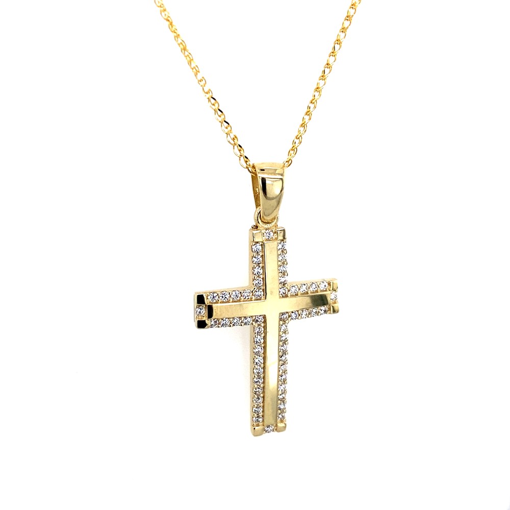 Κομψός σταυρός βάπτισης για κορίτσι από χρυσό 14Κ διακοσμημένος με λαμπερές λευκές πέτρες ζιργκόν σε γραμμική διάταξη.