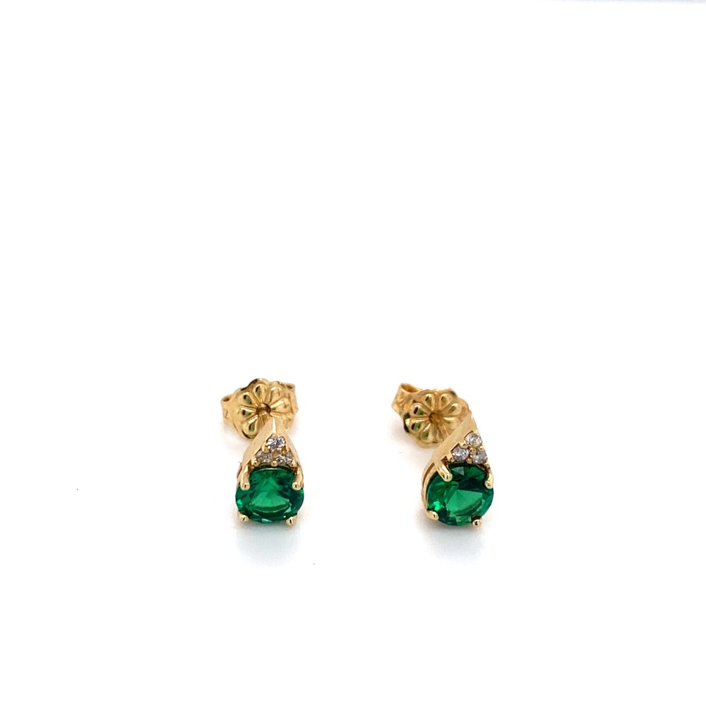 Σκουλαρίκια καρφωτά από χρυσό 14 καρατίων, με κομψό και θηλυκό σχεδιασμό. Διακοσμούνται με λαμπερή πράσινη πέτρα σε σχήμα σταγόνας, που χαρίζει ένταση και χρώμα στο κόσμημα, ενώ μικρές λευκές πέτρες στο επάνω μέρος προσθέτουν διακριτική λάμψη.