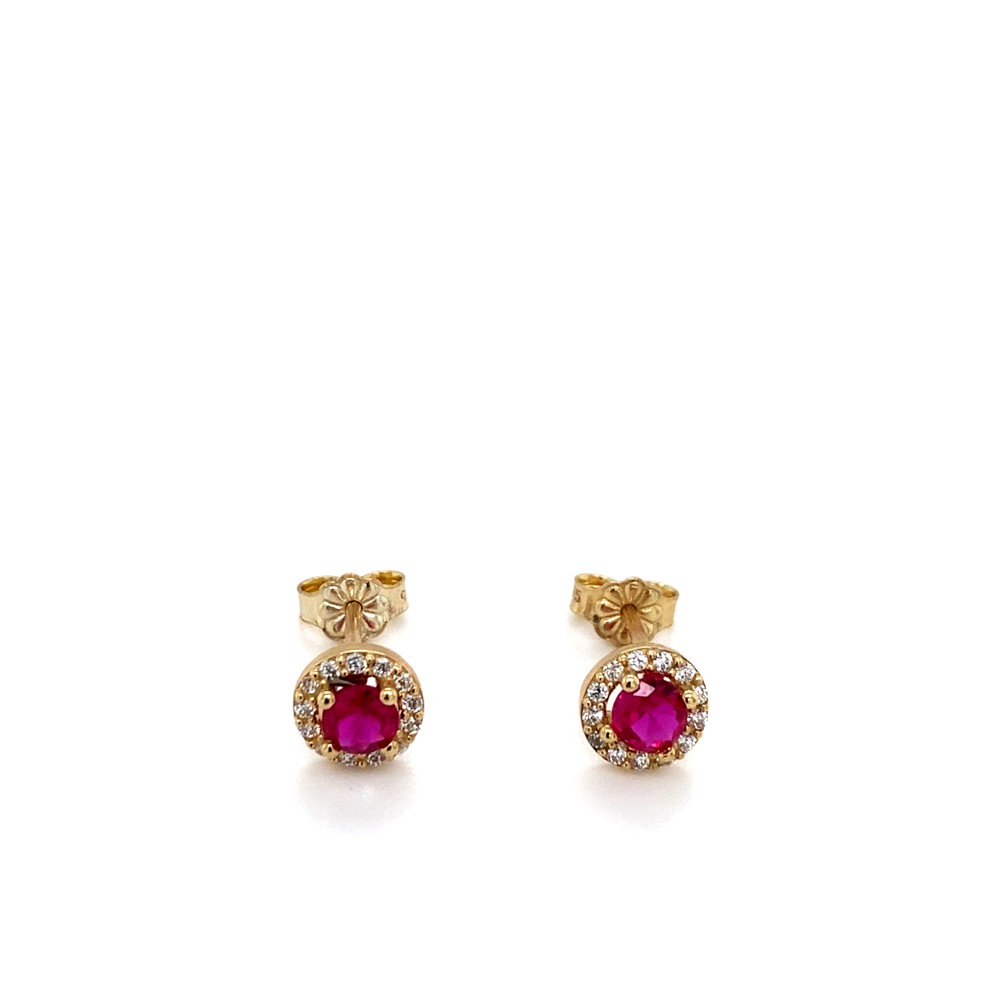 Κομψό σκουλαρίκι τύπου ροζέτα από χρυσό Κ9, διακοσμημένο με εντυπωσιακή κόκκινη πέτρα στο κέντρο, που περιβάλλεται από μικρότερες λαμπερές πέτρες