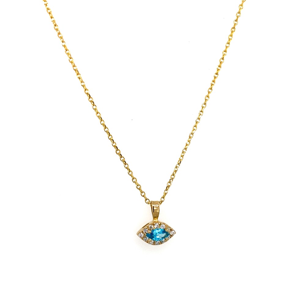 Κολιέ από χρυσό Κ9 με μικρό μενταγιόν σε σχήμα ματιού. Διαθέτει γαλάζια πέτρα στο κέντρο και διακριτικές λευκές πέτρες περιμετρικά. Κομψό και εύκολο φορετό.