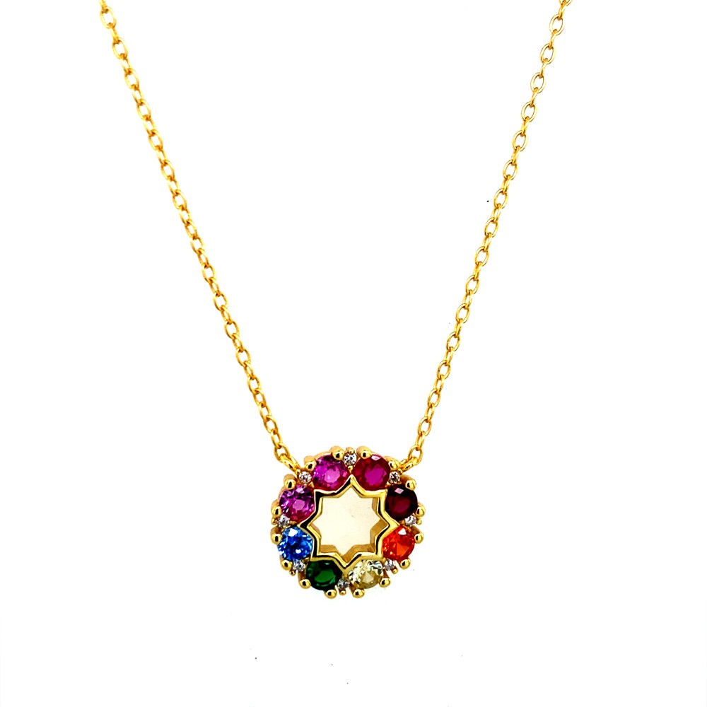 Ασημένιο μενταγιόν σε επιχρυσωμένο μέταλλο με πολύχρωμες πέτρες.