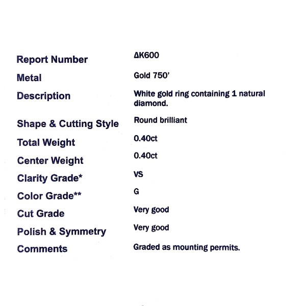 Μονόπετρο δαχτυλίδι από λευκό χρυσό 18Κ με διαμάντι 0,40ct χρώματος G και καθαρότητας VS.