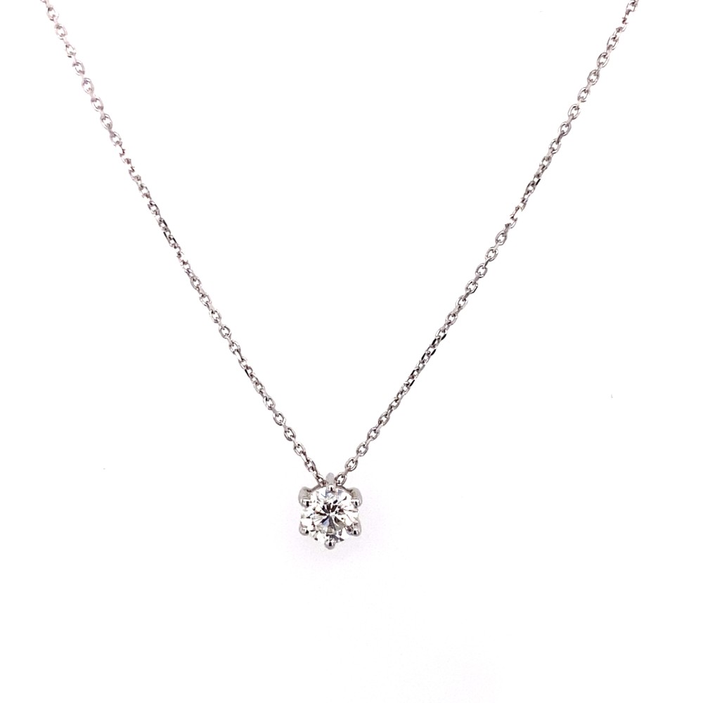 Κομψό μονόπετρο κολιέ με πέτρα μπριγιάν και λευκόχρυσο δέσιμο 18 καρατιών.