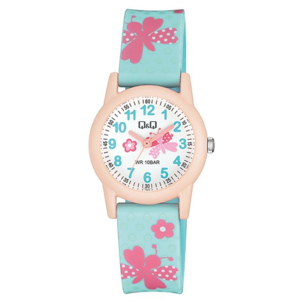 Παιδικό ρολόι Q&Q για κορίτσι με σχέδια και λουράκι από καουτσούκ. Αδιαβροχοποίηση 10 Bar
