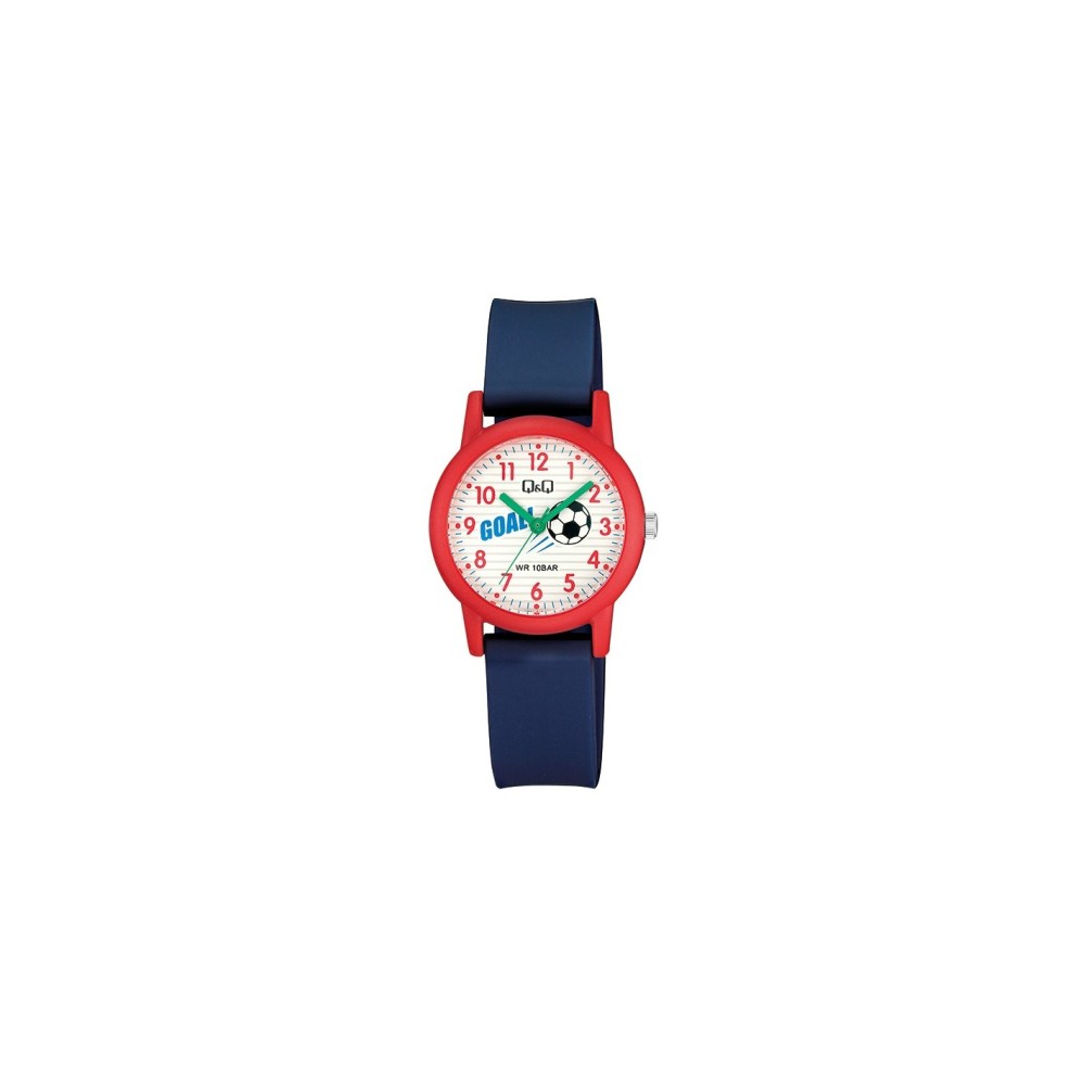 Παιδικό ρολόι Q&Q για αγόρι με λευκό καντράν σχέδιο μπάλα ποδοσφαίρου με μπλε καουτσούκ λουράκι με σχέδια.
