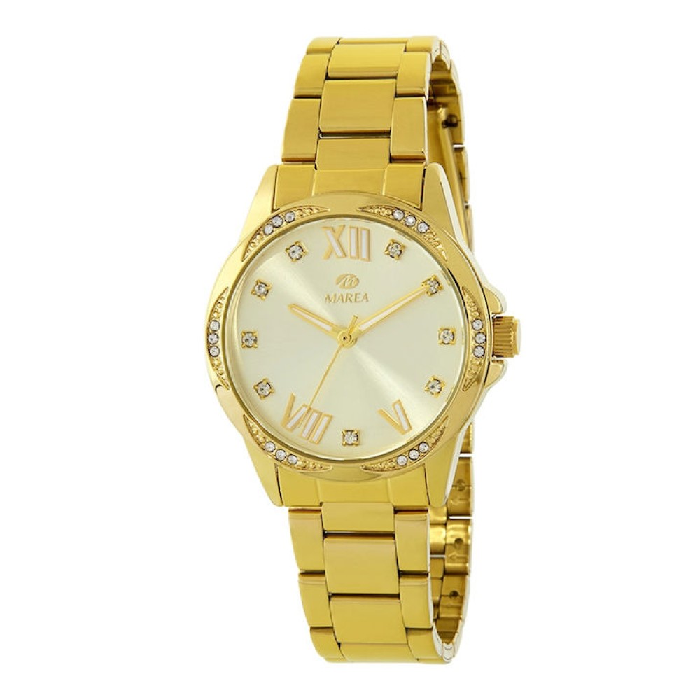 Γυναικείο αναλογικό ρολόι από την Marea με στρογγυλό καντράν και χρυσό μεταλλικό μπρασελέ διακοσμημένο με πέτρες ζιργκόν.