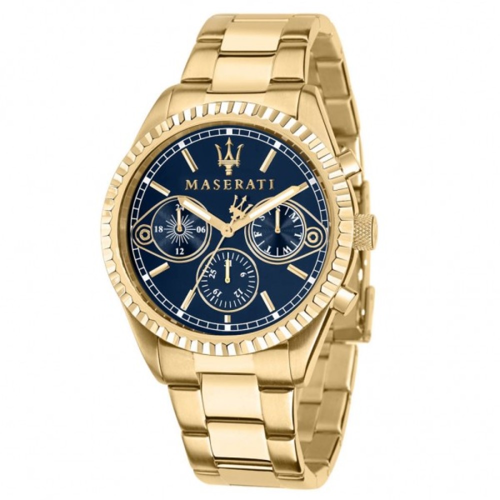Ανδρικό ρολόι Maserati Competizione από ανοξείδωτο ατσάλι χρυσό με μπλε καντράν και ασήμι ανοξείδωτο μπρασελέ.