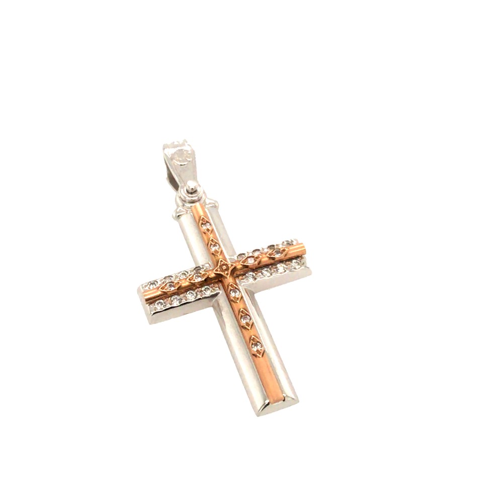 Σταυρός χρυσός 14 καρατίων από δίχρωμο λευκό-ρόζ χρώμα με ζιργκόν.