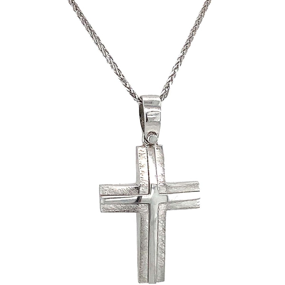 Σταυρός βάπτισης για αγόρι από λευκό χρυσό 9Κ με επιφάνεια ματ σατινέ-λουστρέ.