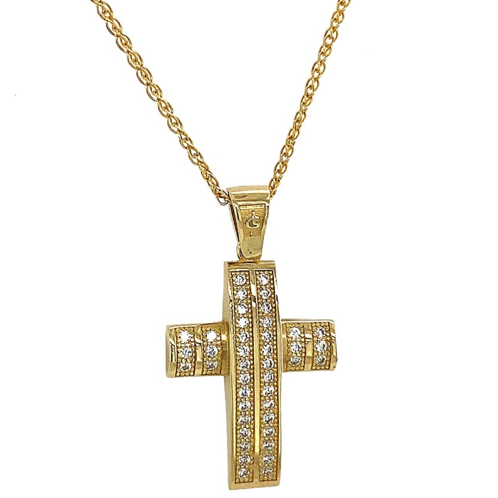 Σταυρός βάπτισης για κορίτσι από χρυσό 14Κ με λουστρέ επιφάνεια και λευκές πέτρες ζιργκόν.