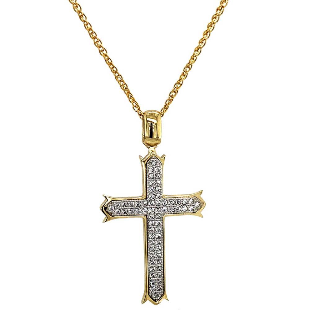 Σταυρός βάπτισης για κορίτσι από χρυσό 14Κ με λουστρέ επιφάνεια, κεντημένος με λευκά ζιργκόν στο εσωτερικό του.