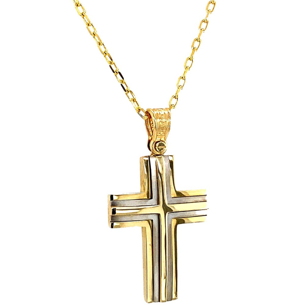 Σταυρός βάπτισης για αγόρι από δίχρωμο χρυσό 14Κ με λουστρέ επιφάνεια.