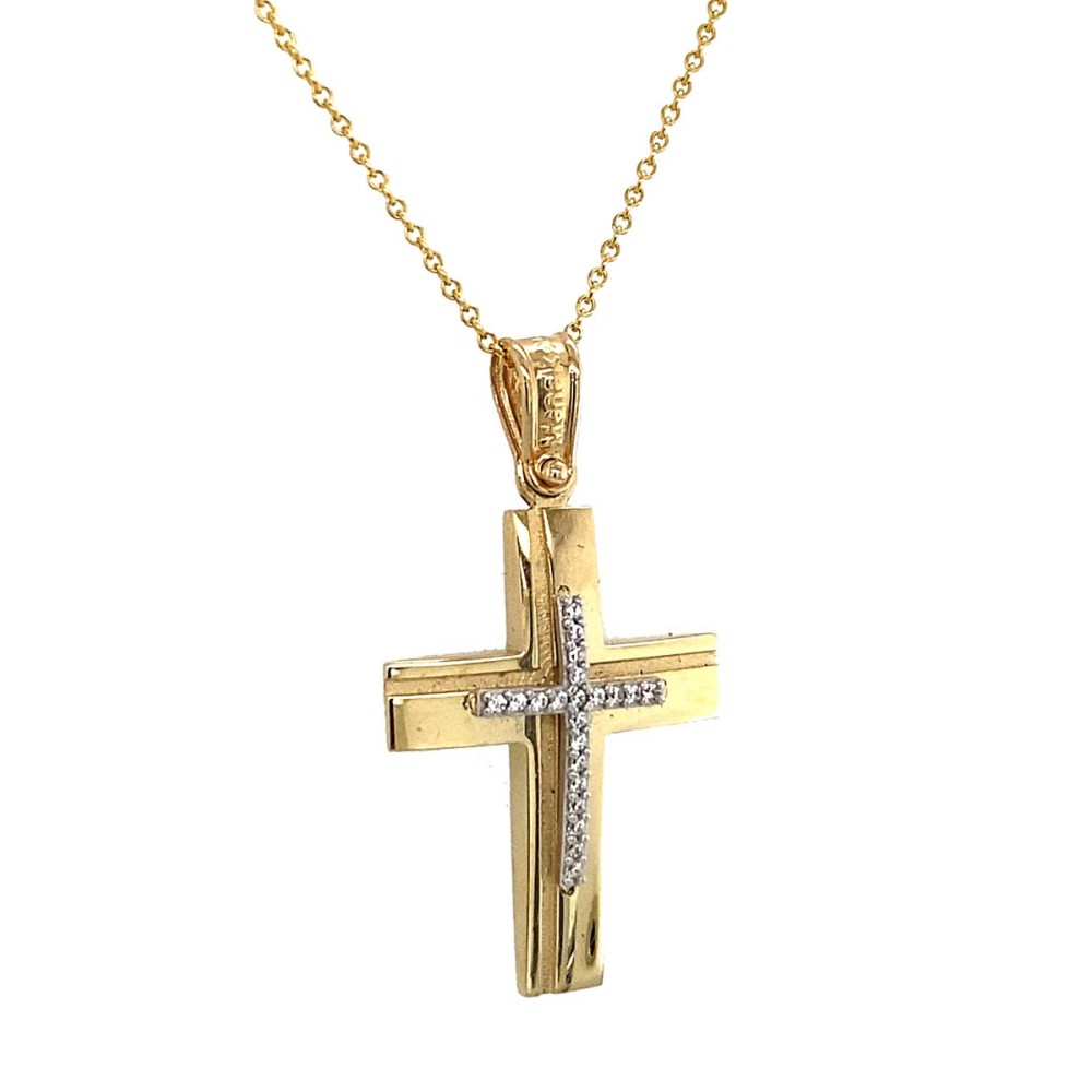 Σταυρός βάπτισης από δίχρωμο χρυσό λευκό-κίτρινο 14Κ με λουστρέ επιφάνεια και λευκά ζιργκόν.