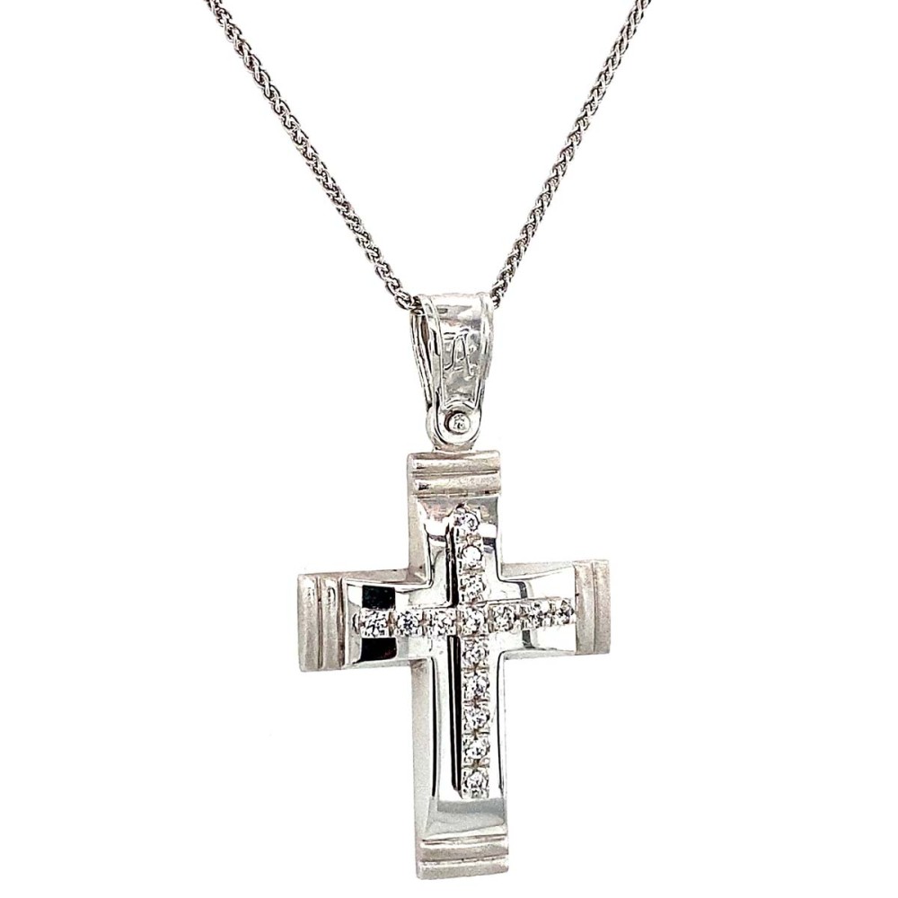 Σταυρός βάπτισης παιδικός για κορίτσι από λευκό χρυσό 14Κ με πέτρες ζιργκόν, επιφάνεια λουστρέ.