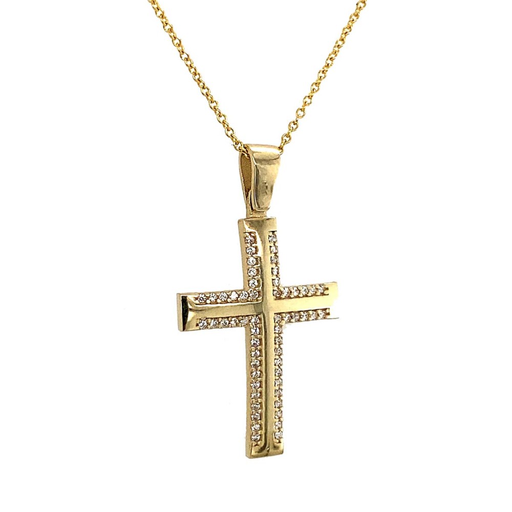 Σταυρός βάπτισης από χρυσό 14Κ με λουστρέ επιφάνεια και λευκές πέτρες ζιργκόν περιμετρικά.