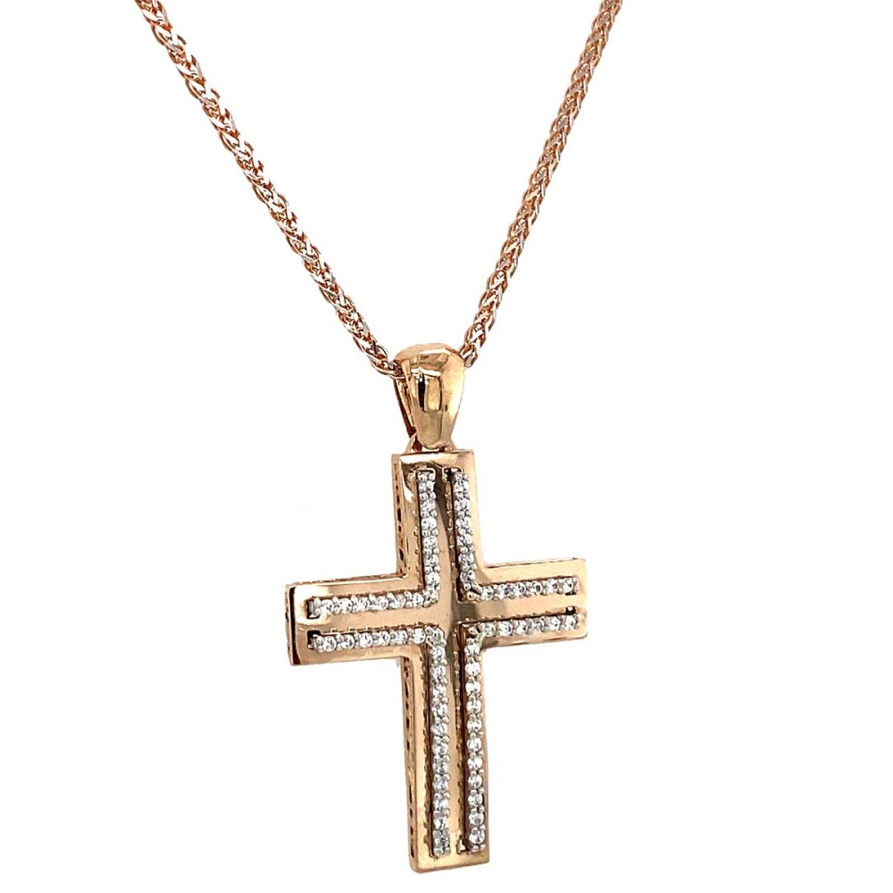 Σταυρός βάπτισης για κορίτσι από ροζ χρυσό 14Κ με λουστρέ επιφάνεια και λευκά ζιργκόν.