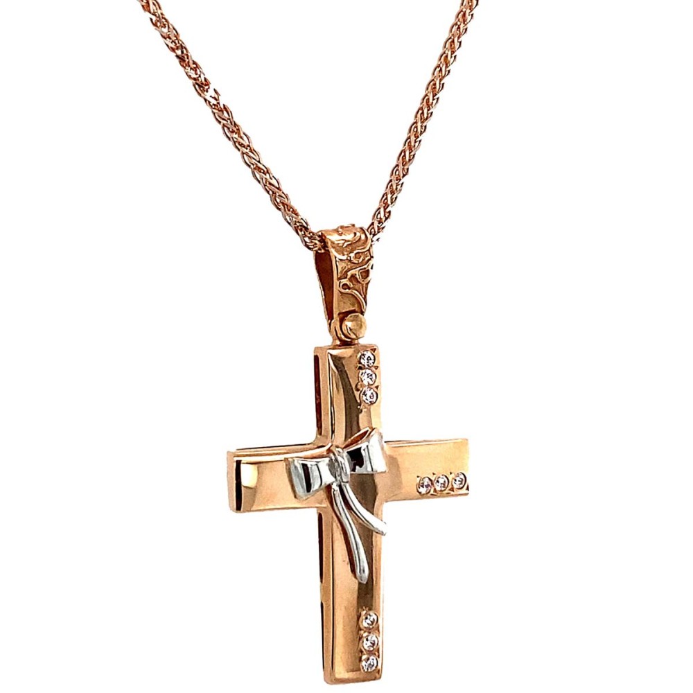 Σταυρός βάπτισης για κορίτσι από ροζ χρυσό 14Κ σχέδιο φιογκάκι από λευκό χρυσό 14Κ με λουστρε επιφάνεια και λευκά ζιργκόν.