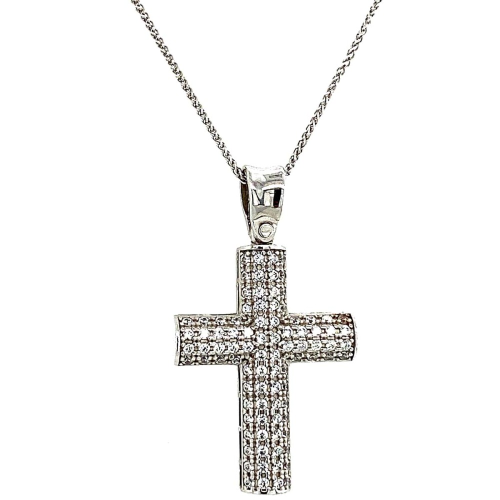 Σταυρός βάπτισης από λευκό χρυσό 14Κ με λευκές πέτρες ζιργκόν σε όλη την επιφάνεια.