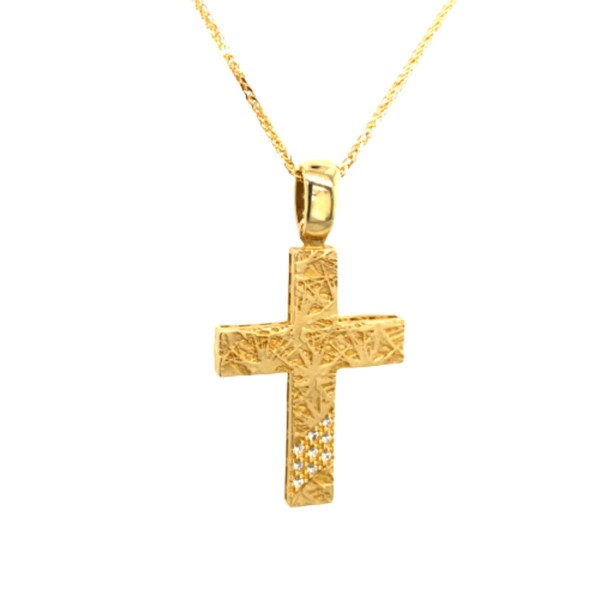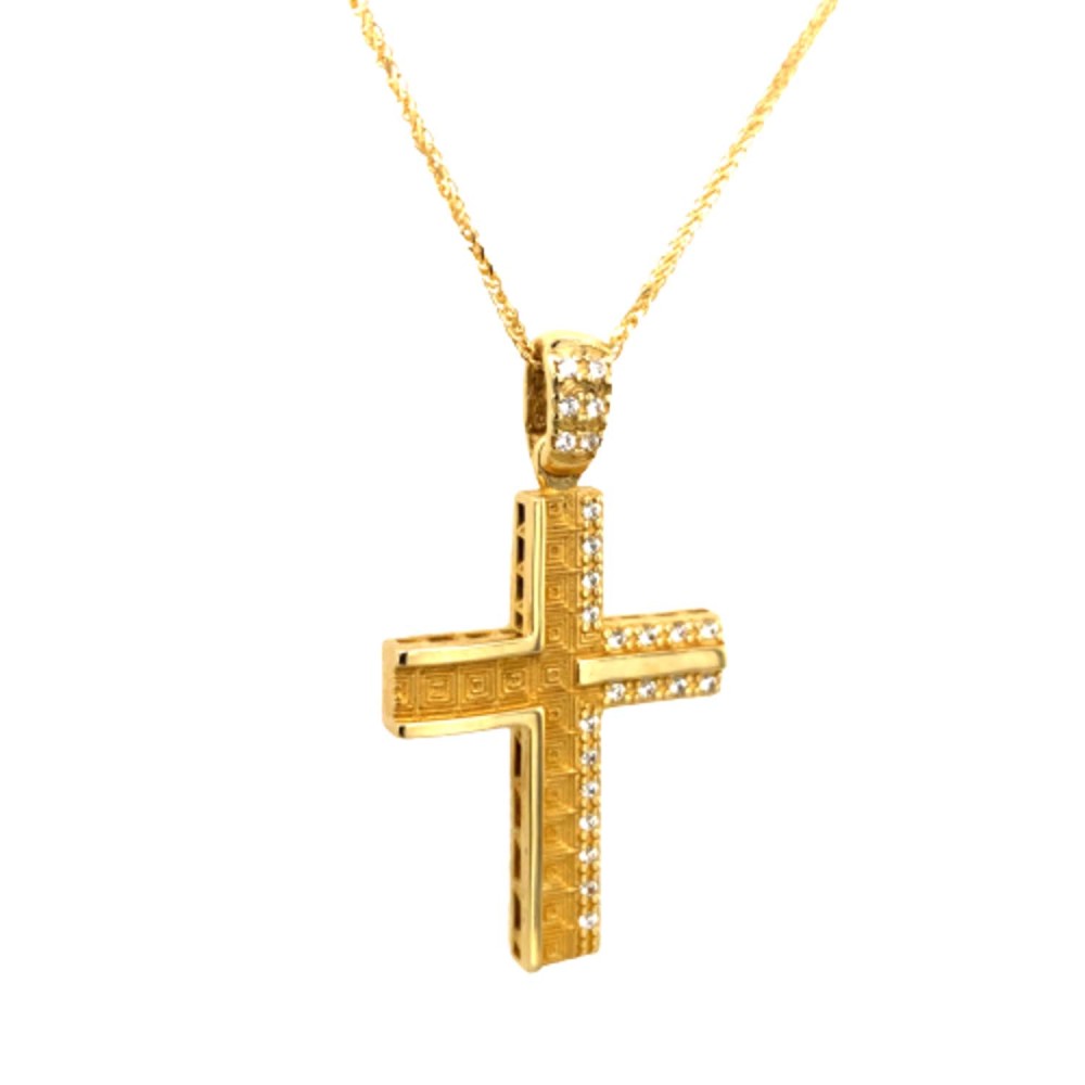 Εντυπωσιακός Σταυρός Βάπτισης για κορίτσι διπλής όψης από χρυσό 14Κ, διακοσμημένος με λευκά ζιργκόν.