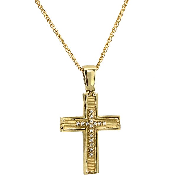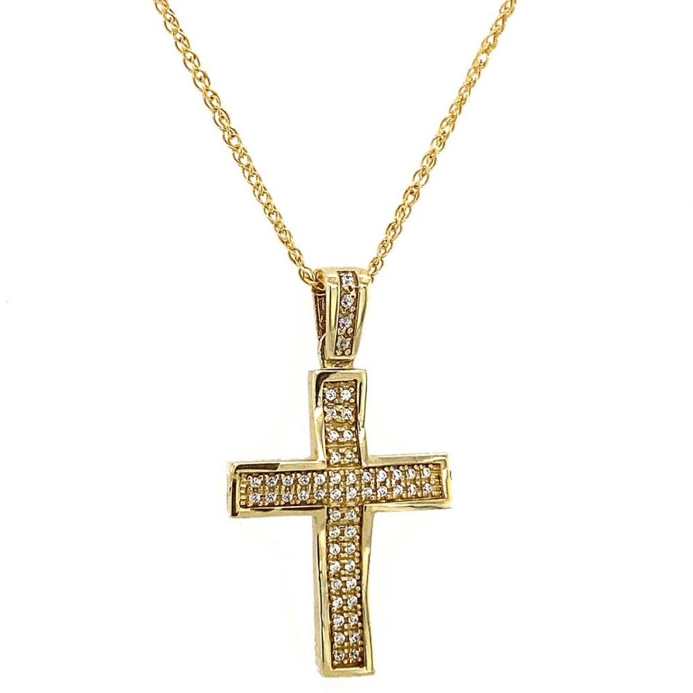 Σταυρός βάπτισης διπλής όψης για κορίτσι από χρυσό 14Κ με ωραία κοψίματα, λουστρέ επιφάνεια και λευκά ζιργκόν.