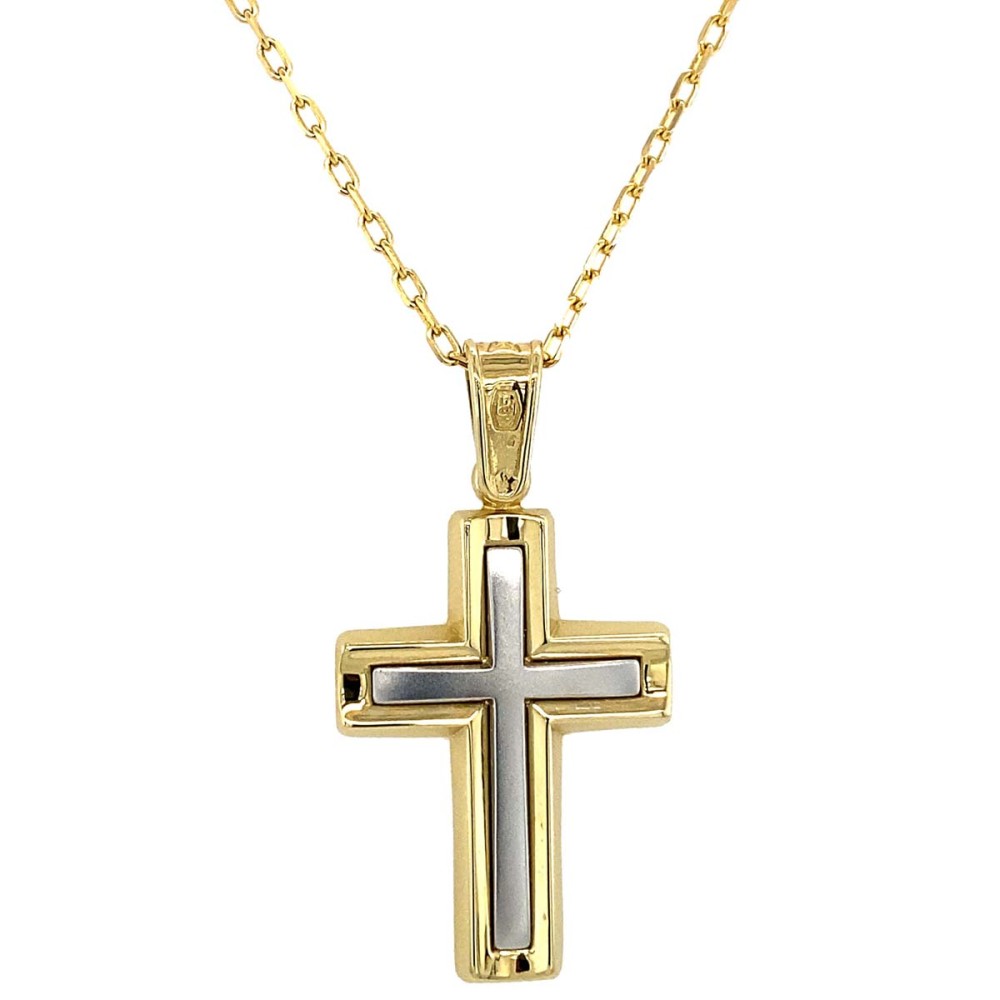 Σταυρός βάπτισης για αγόρι από δίχρωμο χρυσό 14Κ, επιφάνεια λουστρέ και κοψίματα στις άκρες.