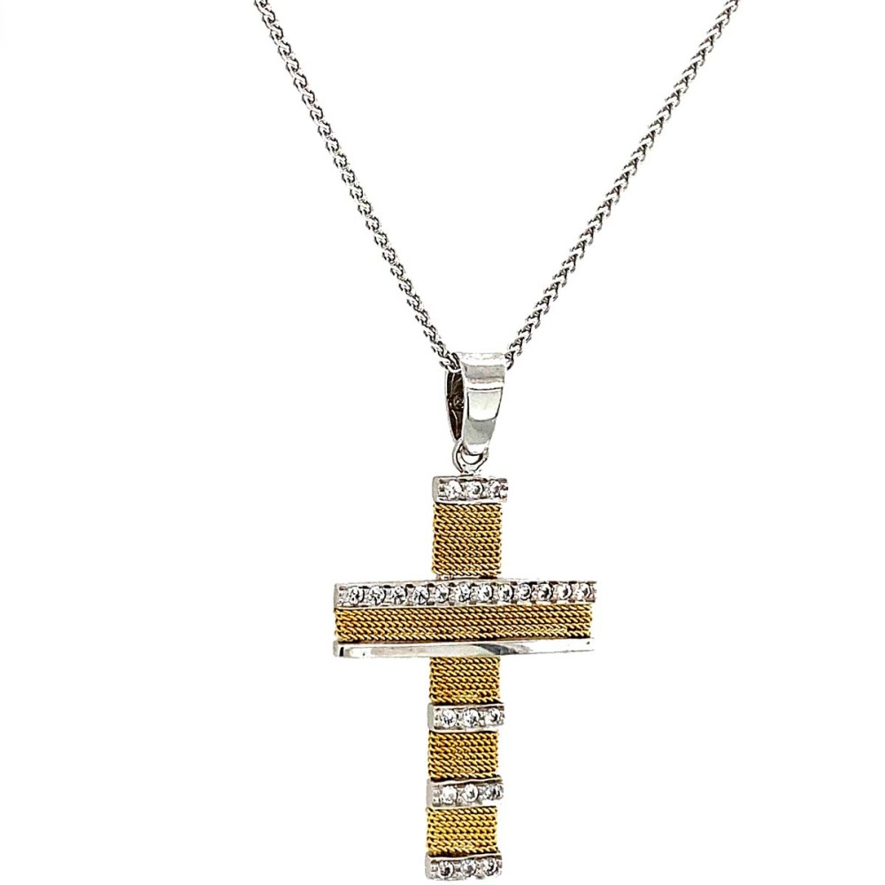 Σταυρός βάπτισης για κορίτσι από δίχρωμο χρυσό 14Κ με λουστρέ επιφάνεια και λευκά ζιργκόν.