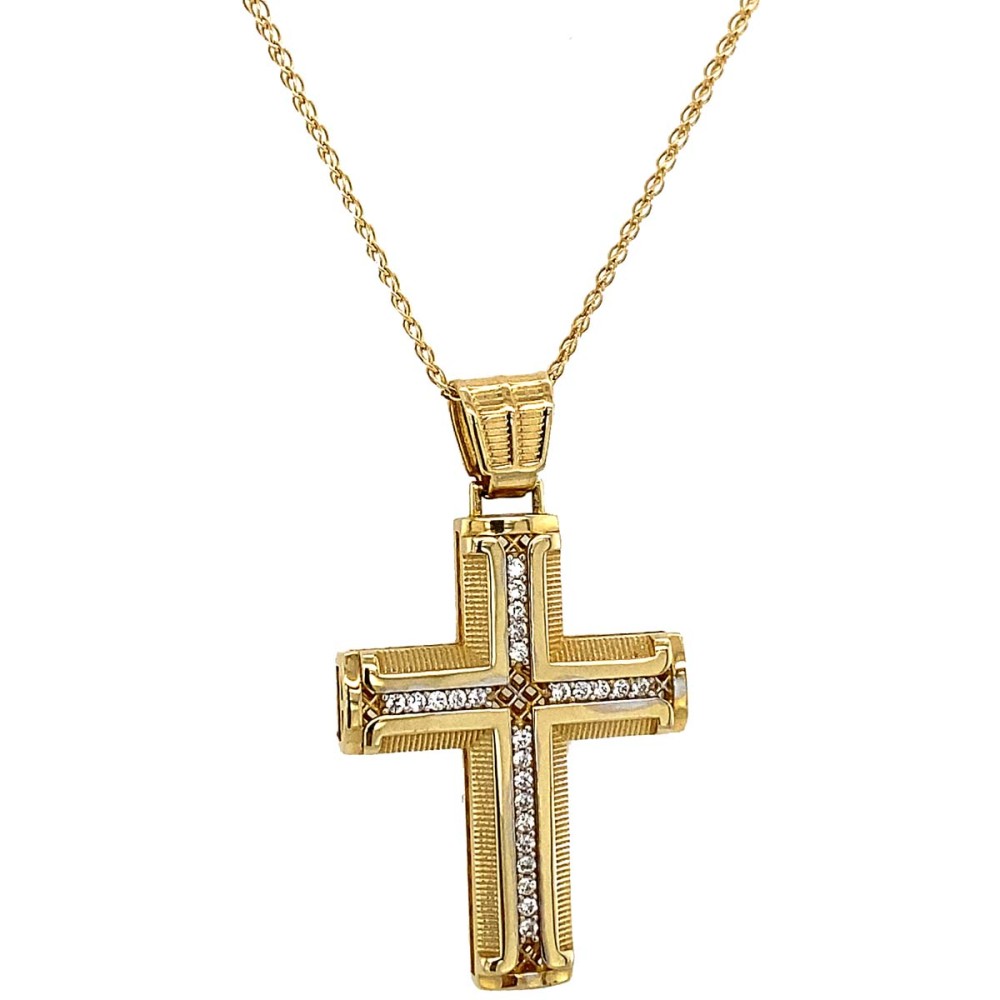 Σταυρός βάπτισης για κορίτσι από χρυσό 14Κ με λουστρέ επιφάνεια και λευκές πέτρες ζιργκόν.