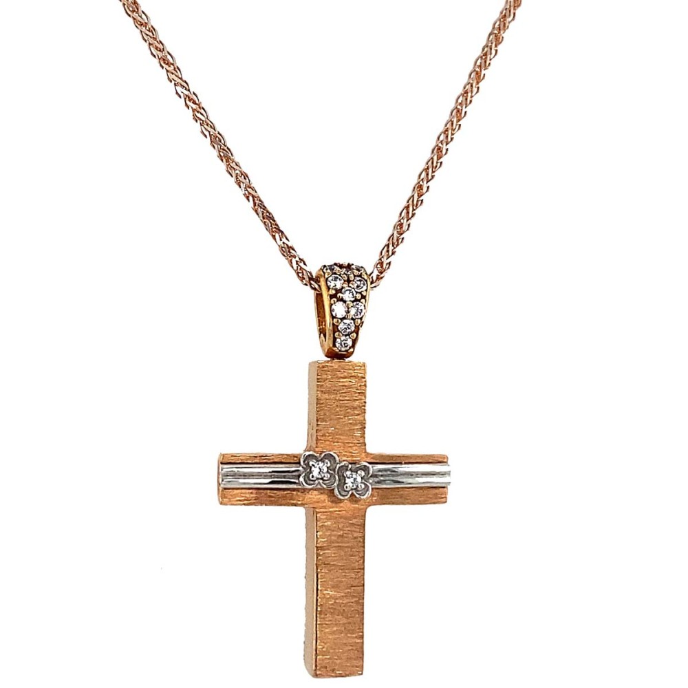 Σταυρός βάπτισης για κορίτσι από δίχρωμο χρυσό 14Κ με επιφάνεια ματ σατινέ και λευκά ζιργκόν.