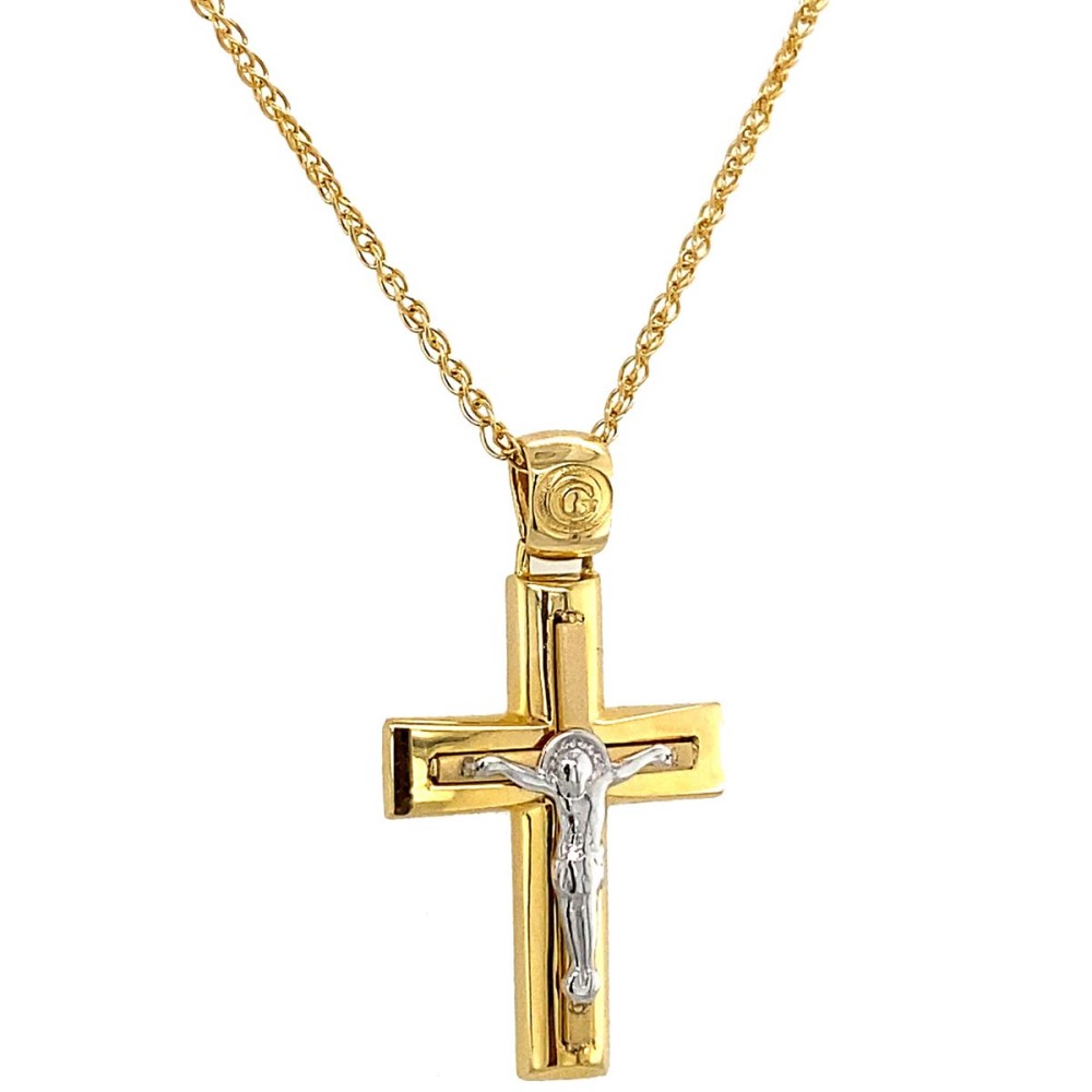 Σταυρός βάπτισης για αγόρι με Τον Εσταυρωμένο από δίχρωμο χρυσό 14Κ με λουστρέ επιφάνεια.