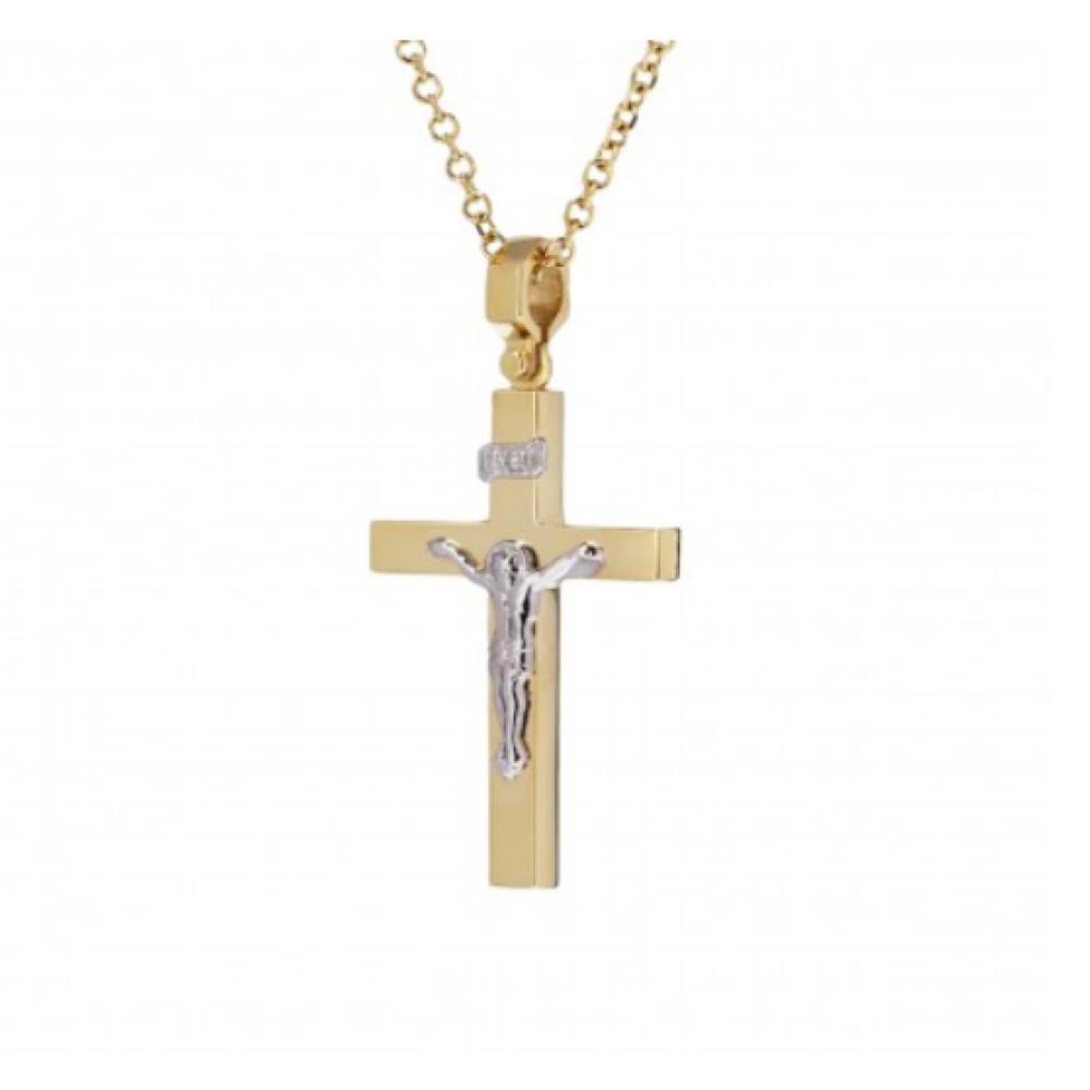 Σταυρός βάπτισης για αγόρι από δίχρωμο χρυσό 14Κ σε λουστρέ επιφάνεια με Τον Εσταυρωμένο.