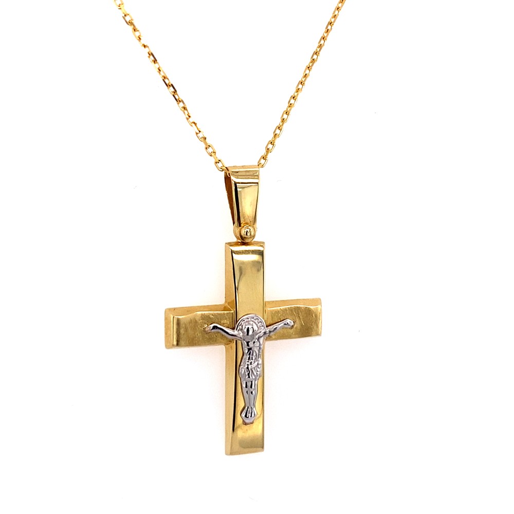 Σταυρός βάπτισης για αγόρι από δίχρωμο χρυσό με τον Εσταυρωμένο, χρυσό 14Κ με επιφάνεια σαγρέ-λουστρέ.