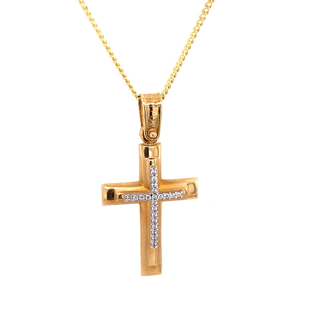 Σταυρός από κίτρινο χρυσό 14 καρατίων με λουστρέ επιφάνεια και ζιργκόν.