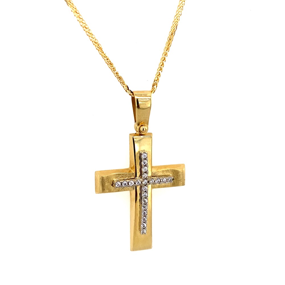 Σταυρός βάπτισης για κορίτσι από δίχρωμο χρυσό 14Κ σε σαγρέ επιφάνεια με λευκές πέτρες ζιργκόν.