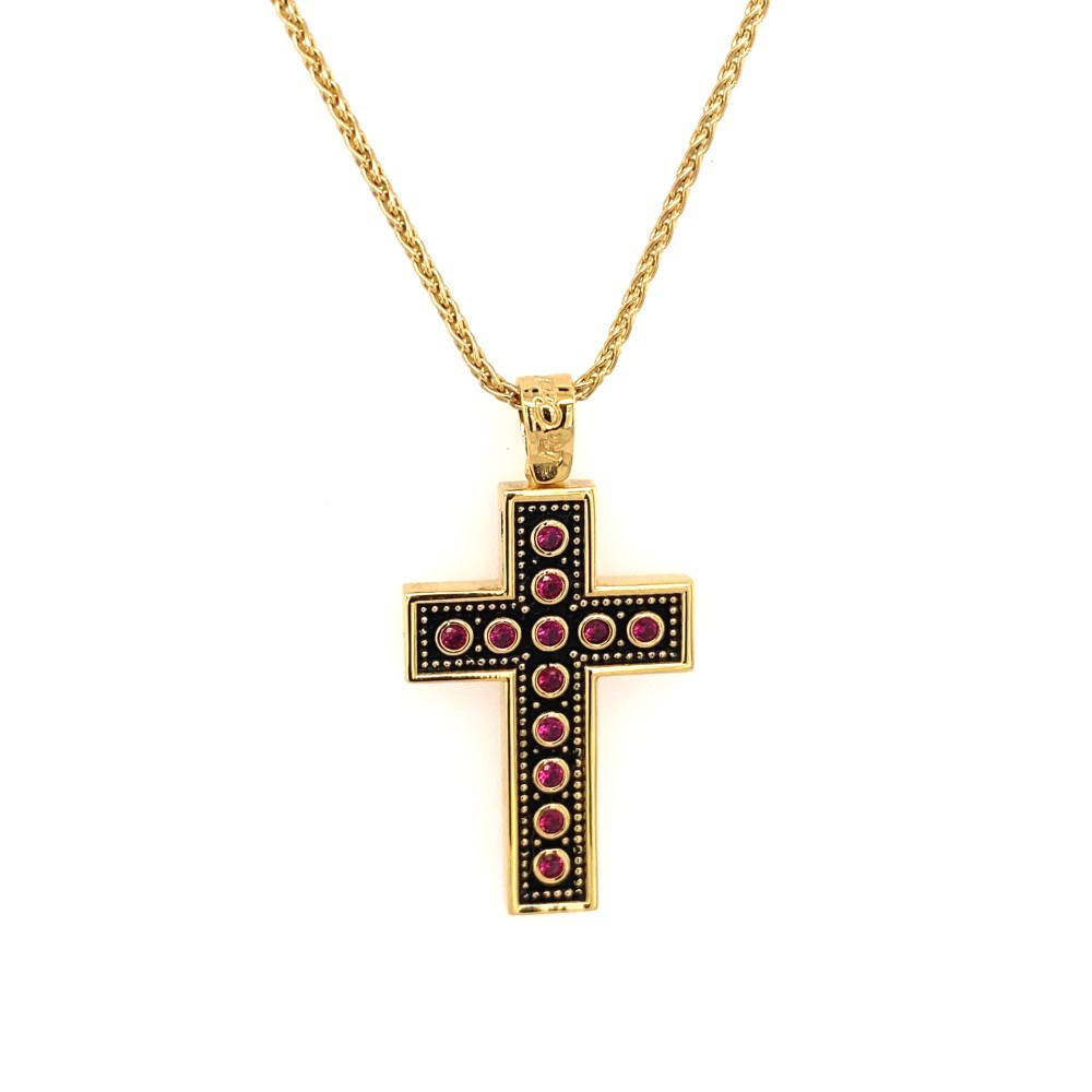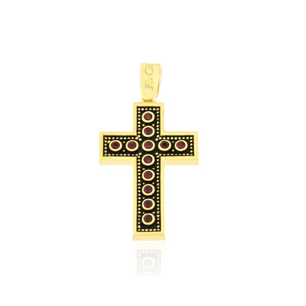 Σταυρός FaCad'Oro γυναικείος από κίτρινο-μαύρο χρυσό 14Κ με ροζ ζιργκόν πέτρες.