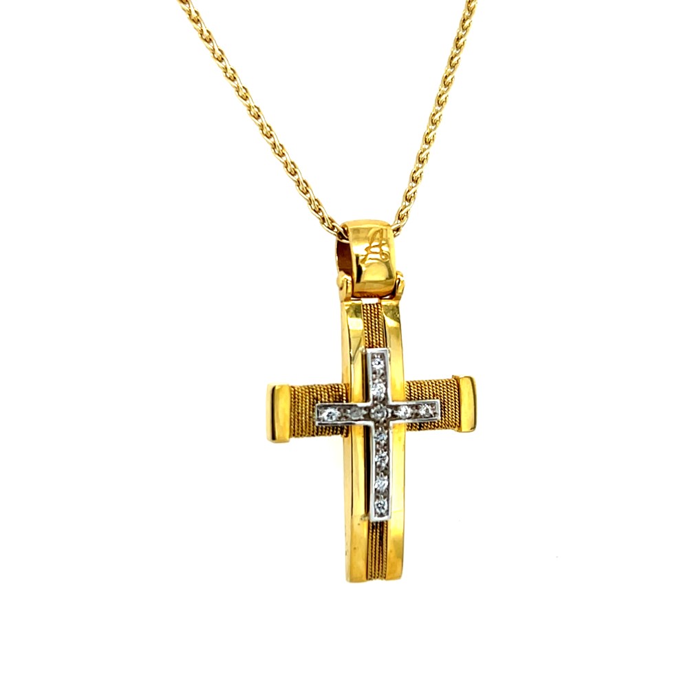Γυναικείος-Βαπτιστικός Σταυρός χειροποίητος συρμάτινος σε κίτρινο χρυσό Κ14 με λευκά ζιργκόν.