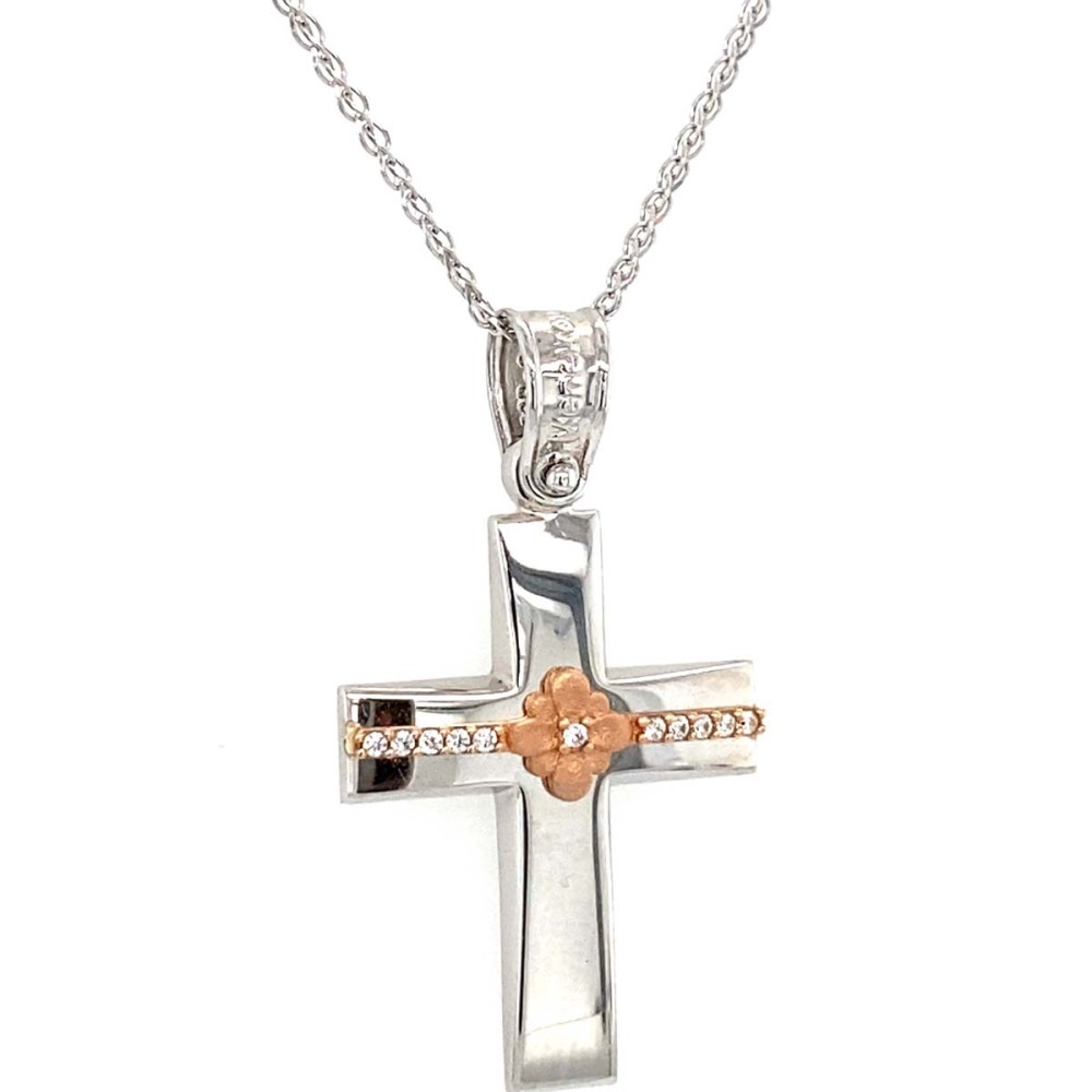 Φύλο: Κορίτσι, Μέταλλο: Χρυσός 14Κ, Χρώμα: Λευκό-Ρόζ, Φινίρισμα: Λούστρε, Πέτρες: Ζιργκόν, Διαστάσεις: 3,2cm x 1,8cm, Μέταλλο αλυσίδας: Χρυσός 14Κ, Χρώμα: Λευκό, Βάρος: 1,8gr, Μήκος αλυσίδας: 45,0cm Τιμή Σταυρού: 260,00€ Τιμή αλυσίδας: 175,00€