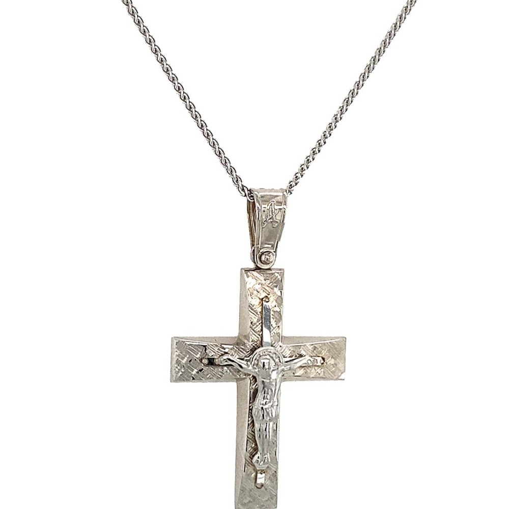 Σταυρός βάπτισης για αγόρι με τον Εσταυρωμένο από λευκό χρυσό 14Κ με σαγρέ επιφάνεια.