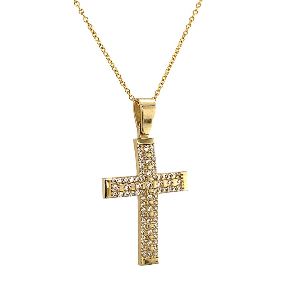 Σταυρός βάπτισης από χρυσό 14Κ με λουστρέ επιφάνεια και λευκά ζιργκόν.