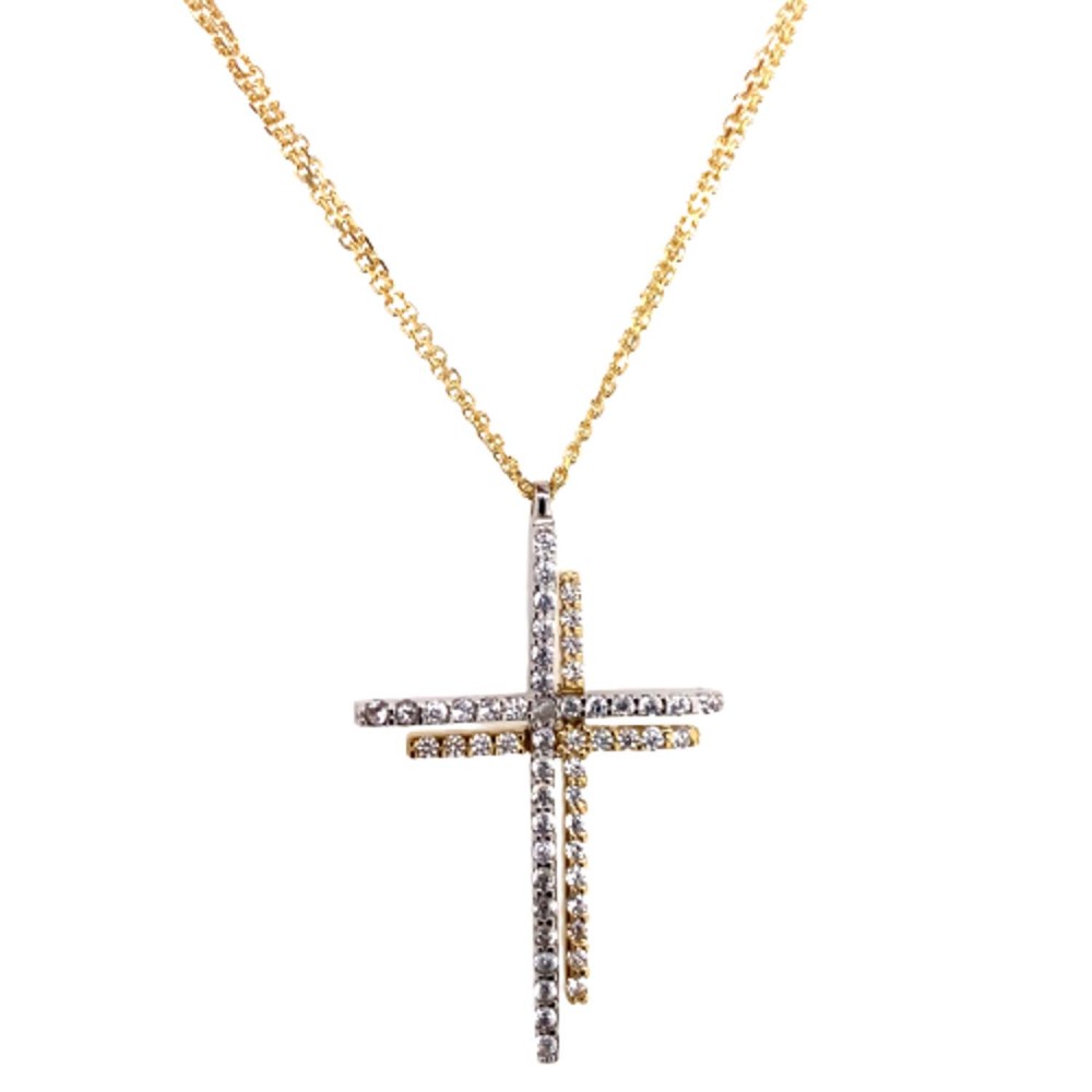 Εντυπωσιακός Σταυρός βάπτισης δίχρωμος, 14Κ με διπλή αλυσίδα και με λευκές πέτρες ζιργκόν.