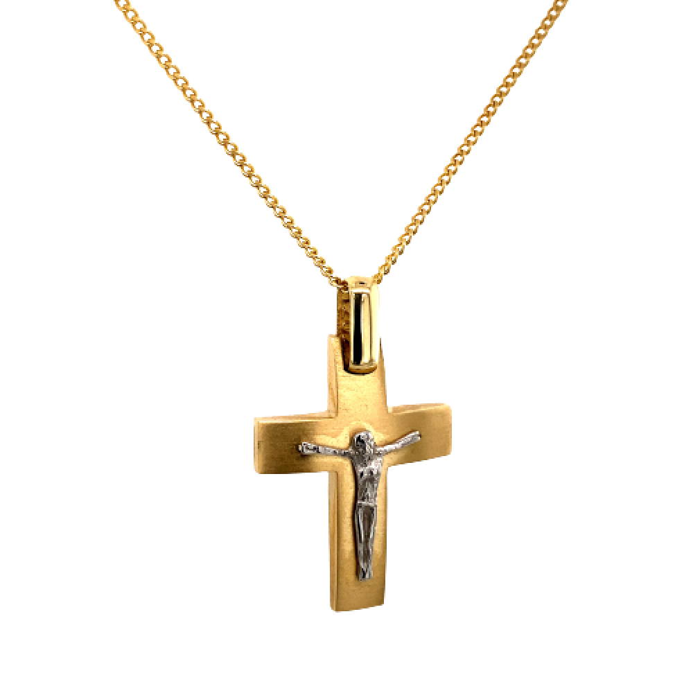 Σταυρός βάπτισης για αγόρι από χρυσό 14Κ σε ματ επιφάνεια με τον Εσταυρωμένο.