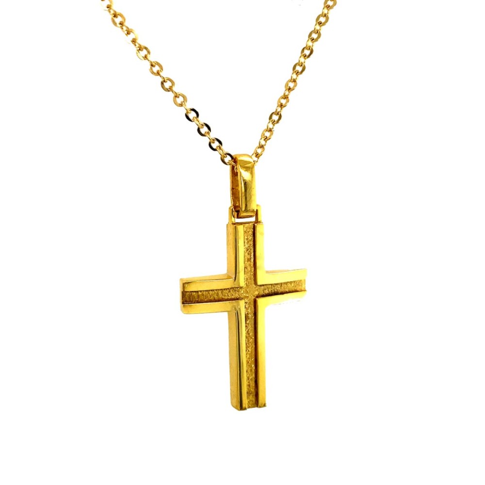 Σταυρός βάπτισης για αγόρι από χρυσό 14Κ με λουστρέ και σαγρέ επιφάνεια στο εσωτερικό.