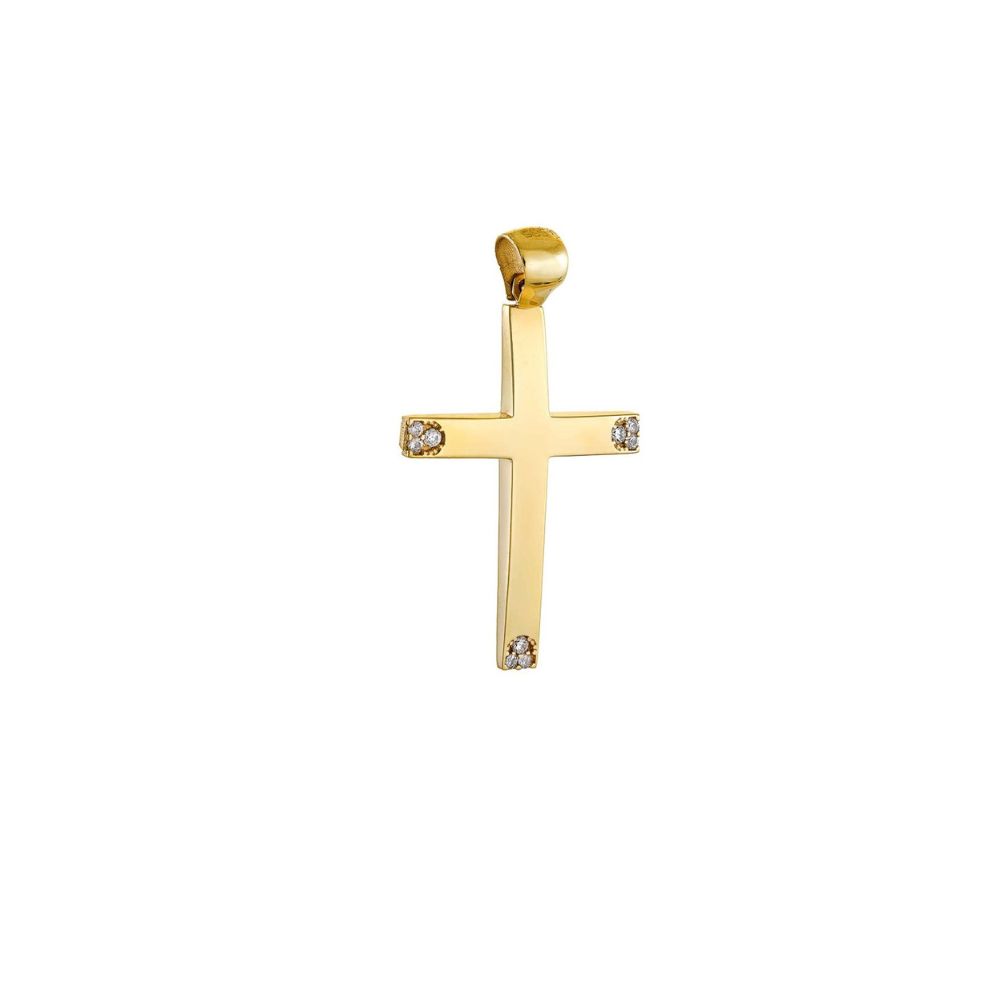 Σταυρός βάπτισης παιδικός για κορίτσι από χρυσό 14Κ με λουστρέ επιφάνεια και λευκές πέτρες ζιργκόν στις άκρες.